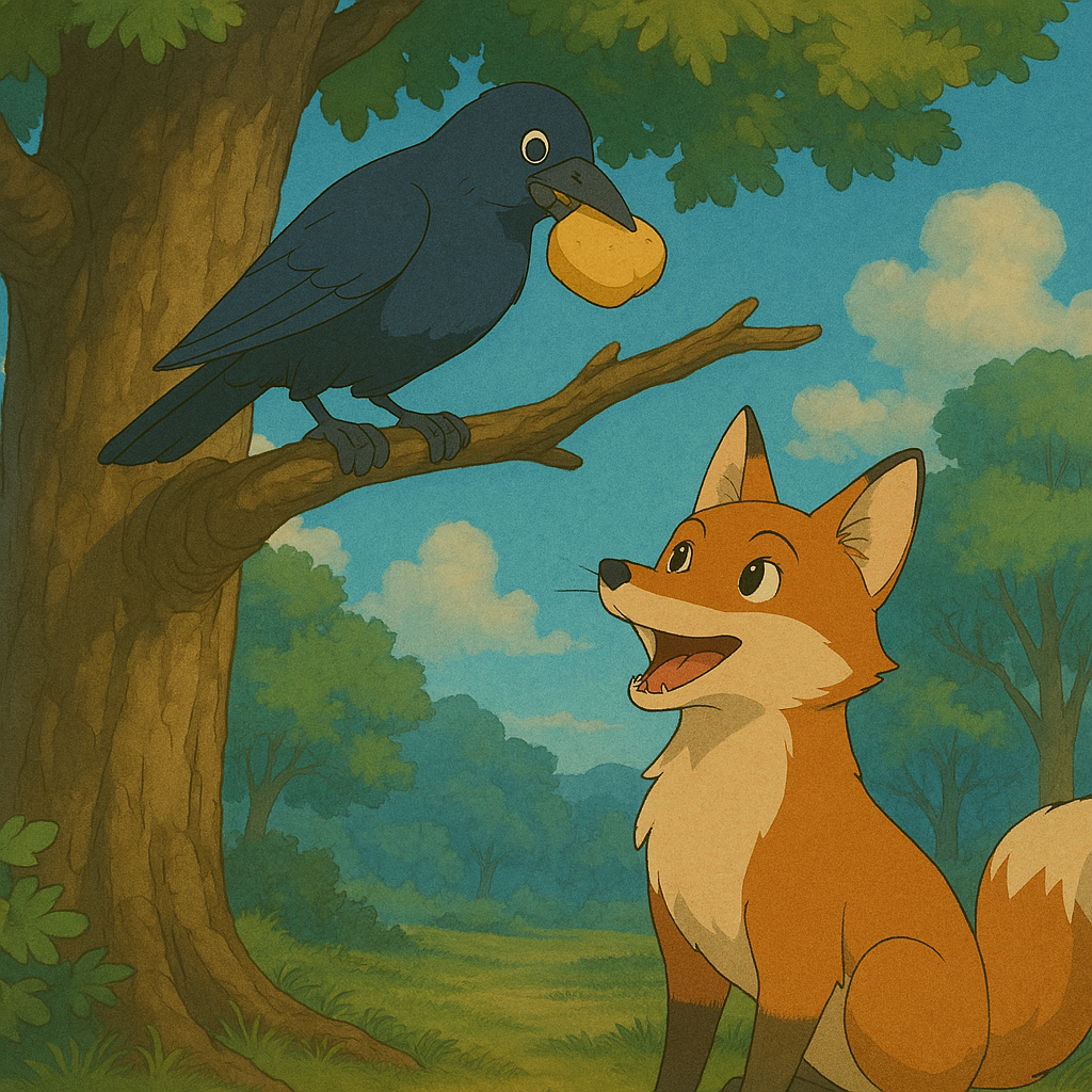 एक हरे-भरे जंगल में एक पेड़ की ऊँची शाखा पर एक कौआ बैठा हुआ था। वह बहुत खुश था, क्योंकि उसे एक घर से बची हुई रोटी का टुकड़ा मिल गया था, जिसे वह लेकर उड़ आया था। वह उस रोटी को मज़े से खाने ही वाला था कि तभी नीचे से एक भूखी लोमड़ी उधर से गुज़री। जैसे ही लोमड़ी ने कौए के मुंह में रोटी देखी, उसके मुंह में पानी आ गया।