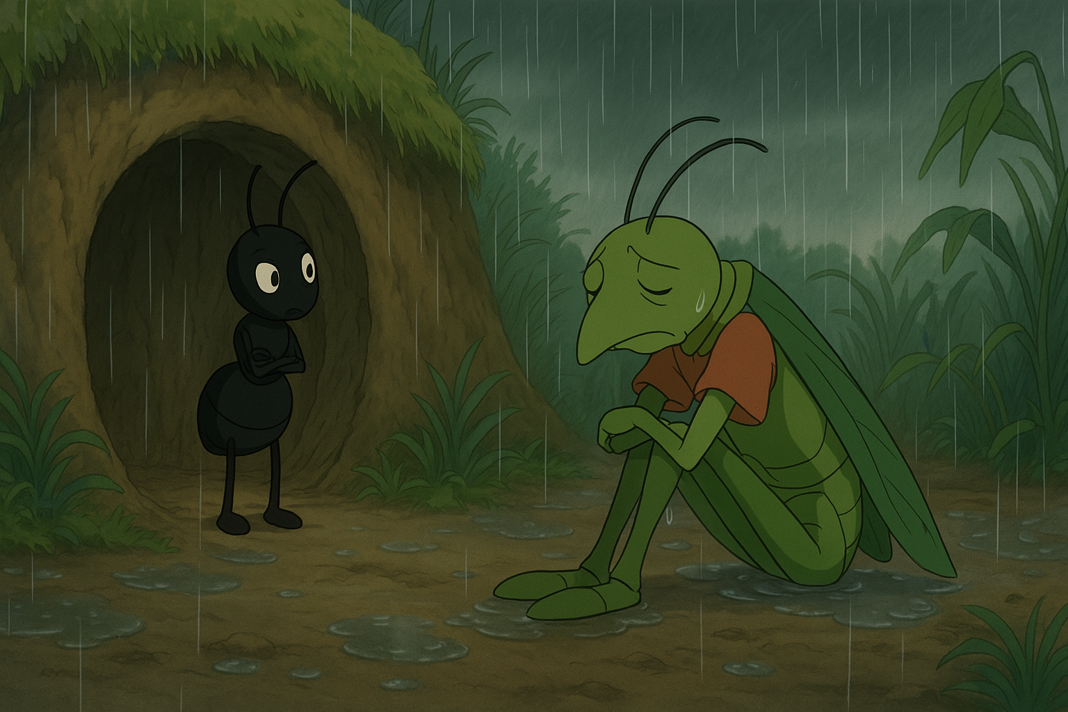 कुछ हफ्तों बाद मौसम ने करवट ली और लगातार कई दिनों तक बारिश होती रही। जंगल में हर जगह पानी भर गया और खाने की चीजें मिलना मुश्किल हो गया। टिड्डा, जिसने कभी खाने का भंडारण नहीं किया था, अब भूख से तड़पने लगा। उसका शरीर कमजोर हो गया, और उसे समझ में नहीं आ रहा था कि अब क्या किया जाए।