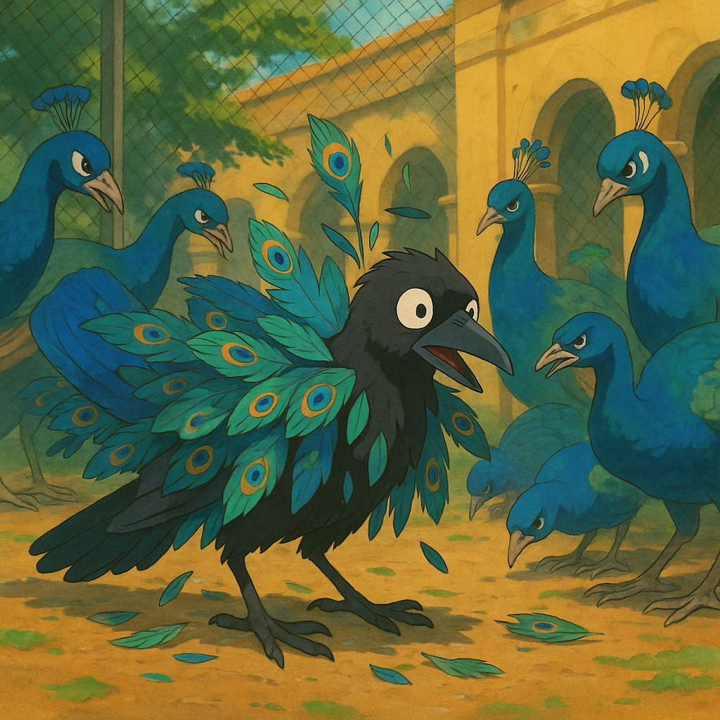 कौआ अब यह तय कर चुका था कि वह किसी भी कीमत पर मोर की नकल कर के मोरों के बीच रहकर उनकी तरह आनंदमयी जीवन जीना चाहता था। उसने सोचा, “अगर मैं भी मोरों के जैसे दिखूं, तो वे मुझे भी अपना दोस्त मानेंगे।” इस विचार से प्रेरित होकर, वह जंगल से गिरे हुए मोर के पंखों को इकट्ठा करने लगा और उन पंखों को अपने शरीर में जोड़ लिया। अब वह एक नकली मोर बन चुका था।