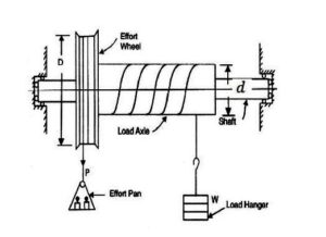 Velocity Ratio (V.R) = [frac up=”Distance moved by the effort” down=”Distance moved by the load”] = [frac up=” πD” down=” πd”] = [frac up=”D” down=”d”]