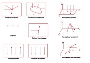 (vii) Coplanar Non-Concurrent Non-Parallel: In this force system, the lines of action of all the forces are in the same plane but are not parallel, do not meet at a point and may not have the same direction.