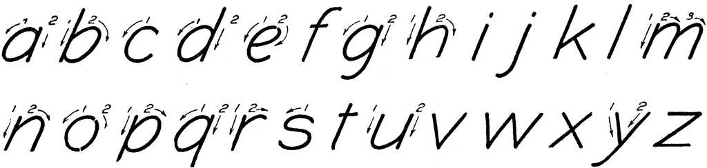 The order and direction of the strokes and the proportion of all inclined lowercase letters are same as for vertical lowercase letters. The lowercase inclined letters may be regraded, like the uppercase inclined letters, as oblique projection of vertical letters in which all of the circles in the vertical alphabet becomes ellipses in the inclined alphabet. As in inclined capital letters, all ellipses have their major axes sloping at an angle of 45° with the horizontal.