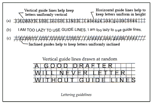 In order to obtain correct and uniform height of letters and numerals in lettering and numbering, guide lines are drawn. Vertical letters do not look pleasant if all the letters are not uniformly vertical and inclined letters do not look good if all the letters are not uniformly inclined. Therefore, in addition to horizontal guide lines, light vertical or inclined guidelines should be used. Vertical guide lines are not used to space the letters instead, to assist in maintaining a uniform uprightness or uniform inclination of letters.