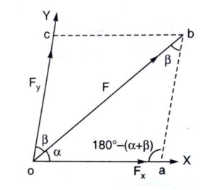 [frac up=”Fx” down=”sin β”] = [frac up=”Fy” down=”sin α”] = [frac up=”F” down=”sin { 180° – (α + β) }”]