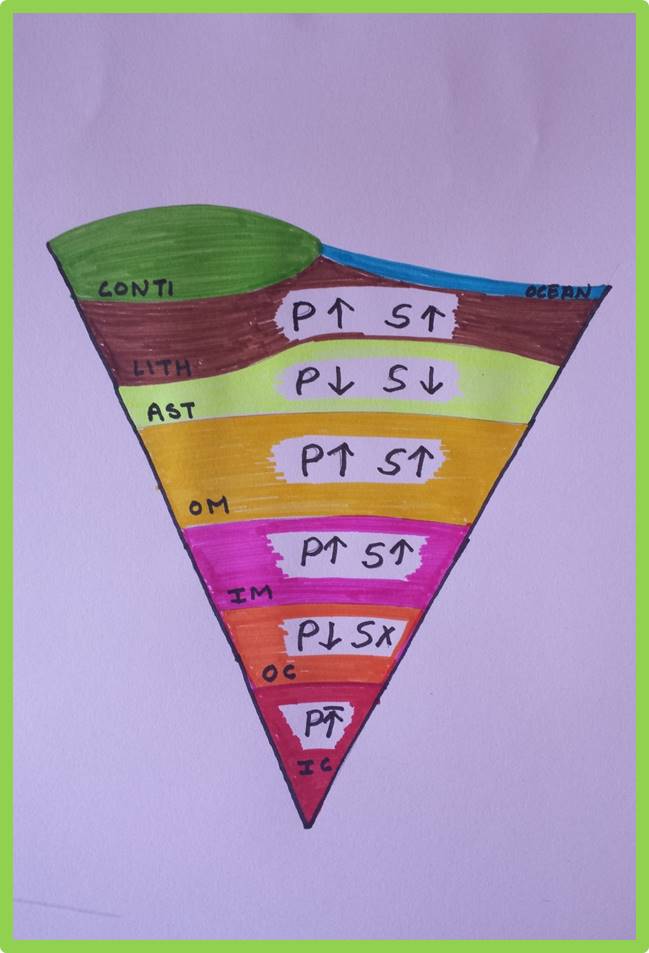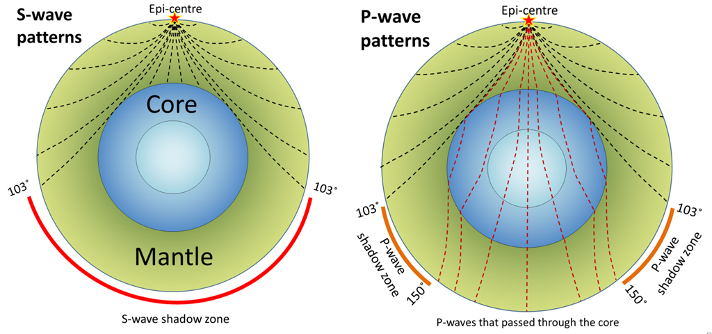 - The boundary between the mantle and the core (Outer core). This is marked by S-waves coming to an abrupt stop, presumably because the outer core is liquid, and a sudden large reduction in the speed of P-waves, as they enter the liquid core where there is no rigidity to contribute to P-wave speed. (P decreases, S stops).