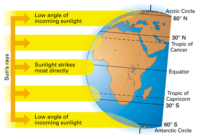 • If the earth were flat that it would receive equal heat in all the zones but the Earth is spherical and due to this sunlight strikes most directly at the equator and torrid zones and makes it heat surplus region. Sunlight does not strikes directly at the temperate zones and frigid zones and due to this reason the sunlight gets dispersed and its heat intensity is reduced thus making the temperate zones and frigid zones a heat deficient region.