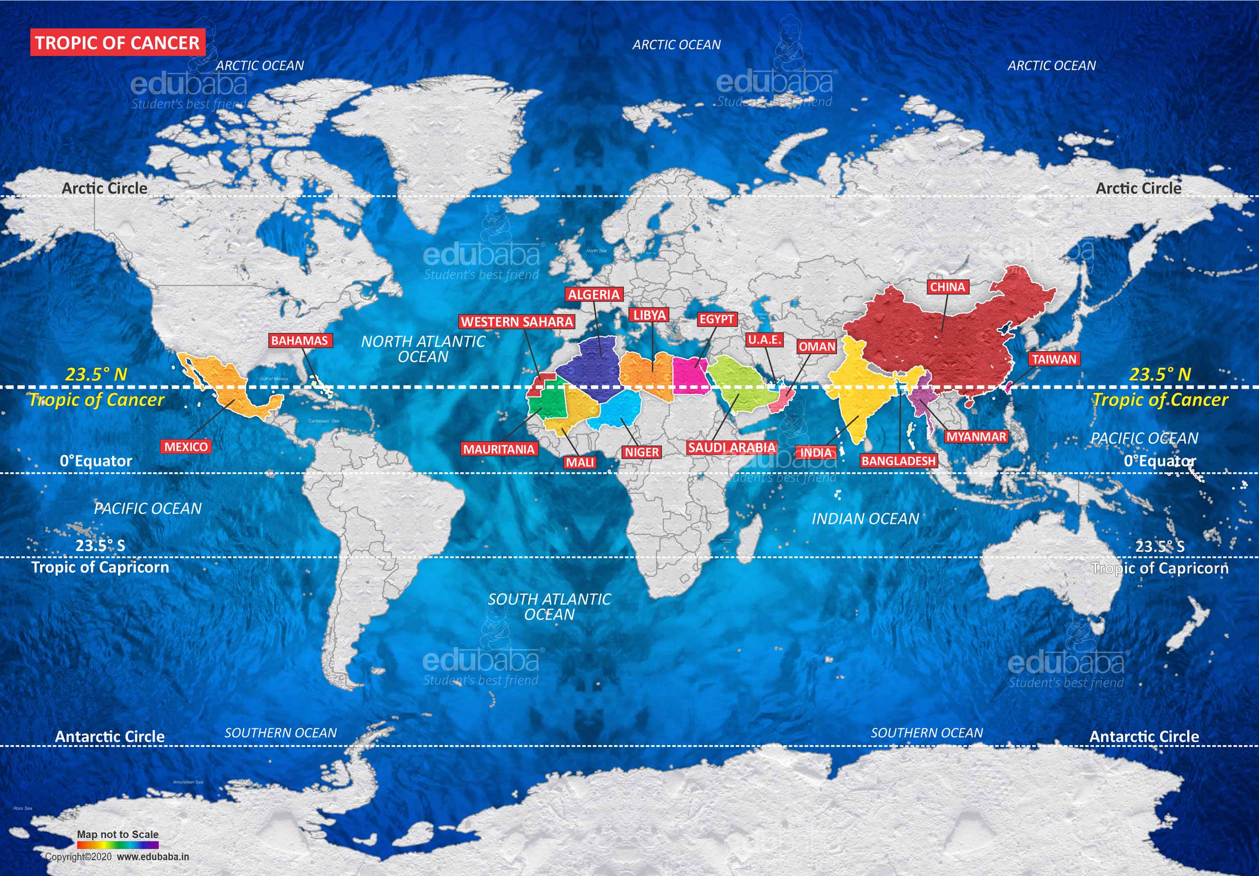• The Tropic of cancer passes through 6 Water Bodies: Indian Ocean, Atlantic Ocean, Pacific Ocean, Taiwan Strait, Red Sea and Gulf of Mexico.