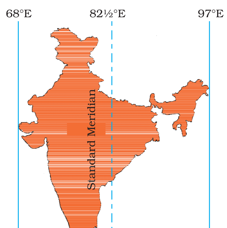 • The Standard Meridian of Indiahas a longitude of 82°30’E. This Standard meridian passes through Mirzapur in Uttar Pradesh and it is considered as the standard time for the whole country.