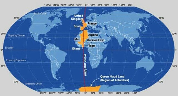 • The Prime Meridian passes through 9 countries: United Kingdom, France, Spain, Algeria, Mali, Burkina Faso, Ghana, Togo and Antarctica.