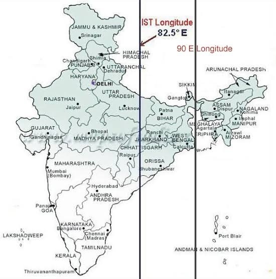 • Indian government has accepted the meridian of 82.5° E for the standard time which is 5 hours 30 minutes ahead of GMT.