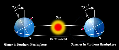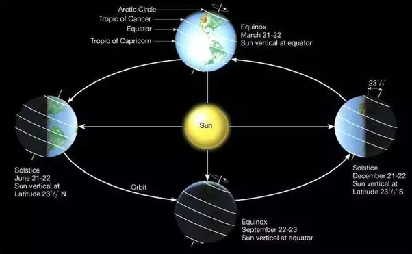 • In between, when the earth is at the major axis then the tilt of the axis is zero, meaning that the tilt is neither away from the sun nor towards the sun. These are the Vernal Equinox or Spring Equinox – the first day of spring and the Autumnal Equinox – the first day of fall. During these times the hours of daylight and night are equal. Both are 12 hours long.