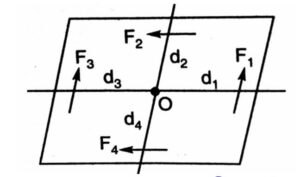 Let O be the point about which the body can rotate. Let d1, d2, d3 and d4 be the perpendicular distance of the point O form the line of action of the forces F1, F2, F3 and F4 respectively. Moment of the forces F1, F2, F3 and F4 about the point O is given:
